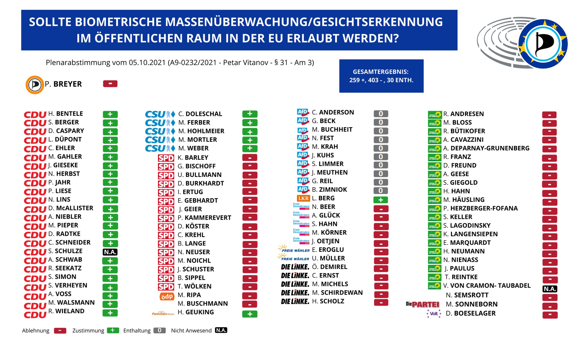 Das Europäische Parlament hat heute mit 259:403:30 Stimmen den Antrag [1] zurückgewiesen, die Forderung nach einem Verbot der biometrischen Massenüberwachung, etwa mittels Gesichtserkennung im öffentlichen Raum, aus dem Vitanov-Bericht über Künstliche Intelligenz im Strafrecht und ihre Nutzung durch Polizei und Justizbehörden in Strafsachen (A9-0232/2021, Abs. 31) [2] zu streichen. Es bleibt damit bei dem Text: „fordert die Kommission daher auf, mit legislativen und nichtlegislativen Mitteln und erforderlichenfalls durch Vertragsverletzungsverfahren ein Verbot jeglicher Verarbeitung biometrischer Daten, einschließlich Gesichtsbildern, zu Strafverfolgungszwecken zu erwirken, wenn diese Verarbeitung zu einer Massenüberwachung in öffentlich zugänglichen Räumen führt; fordert die Kommission ferner auf, die Finanzierung von Forschungsarbeiten, Einsätzen oder Programmen im Zusammenhang mit biometrischen Identifikatoren einzustellen, bei denen die Möglichkeit besteht, dass sie zu einer wahllosen Massenüberwachung in öffentlichen Räumen führen“.